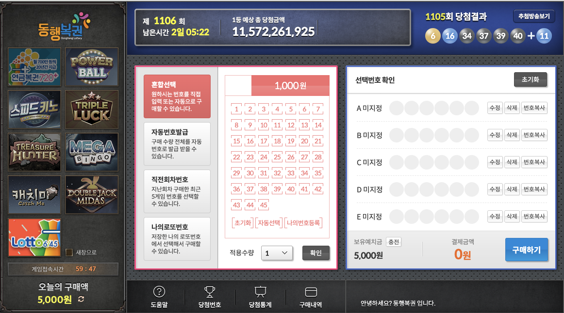 ๋ํ๋ณต๊ถ ํํ์ด์ง์์๋ ์ฐ๊ธ๋ณต๊ถ ๋ฟ๋ง ์๋๋ผ ํ์๋ณผ์ด๋ ์คํผ๋ํค๋ ธ์ ๊ฐ์ ๋ค์ํ ๋ณต๊ถ์ ๊ตฌ๋งคํ ์ ์์ต๋๋ค. ๋ก๋๋ณต๊ถ์ ๊ฒฝ์ฐ์๋ ์๋์ ๊ฐ์ด ๋ฒํธ๋ฅผ ์ ํํ๊ฑฐ๋ ์๋๋ฒํธ๋ฐ๊ธ์ ์ ํํ์ฌ ์๋์ผ๋ก๋ ๊ตฌ๋งคํ์ค ์ ์์ต๋๋ค. ์ ํ๋ฒํธ๋ฅผ ํ์ธํ์ ํ, ํ๋จ ์ค๋ฅธ์ชฝ์ [๊ตฌ๋งคํ๊ธฐ]๋ฅผ ํด๋ฆญํ์๋ฉด ๋ณต๊ถ์ด ๊ตฌ๋งค๋ฉ๋๋ค.
