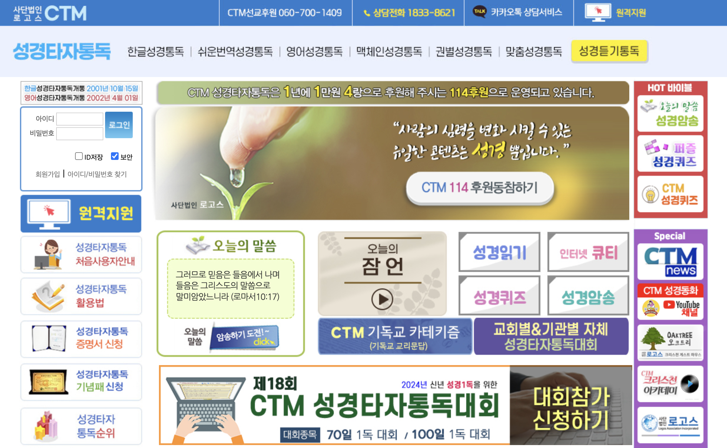 CTM μ„±κ²½νƒ€μžν†΅λ…μ€ 컴퓨터 νƒ€μžμ—°μŠ΅μ„ ν•  수 μžˆμœΌλ©΄μ„œ λ™μ‹œμ— 성경도 곡뢀할 수 μžˆμ–΄ λ§Žμ€ λΆ„λ“€μ—κ²Œ μΈκΈ°μžˆλŠ” ν”„λ‘œκ·Έλž¨μž…λ‹ˆλ‹€. CTM μ„±κ²½νƒ€μžν†΅λ…μ€ μ•„λž˜μ˜ μ‚¬μ΄νŠΈμ—μ„œ 직접 ν™œμš©ν•˜μ‹€ 수 μžˆλŠ”λ°μš”. 성경읽기와 μ„±κ²½ν€΄μ¦ˆ, 성경암솑과 λ”λΆˆμ–΄ μ„±κ²½νƒ€μž ν†΅λ…λŒ€νšŒκΉŒμ§€ μžˆμ–΄ λ‹€μ–‘ν•œ 재미λ₯Ό λŠλΌμ‹€ 수 μžˆμŠ΅λ‹ˆλ‹€.